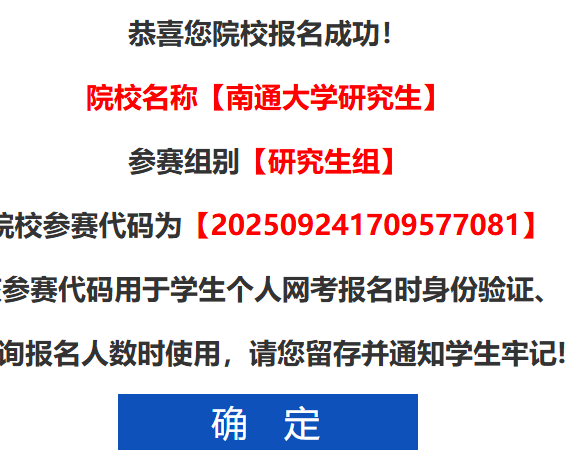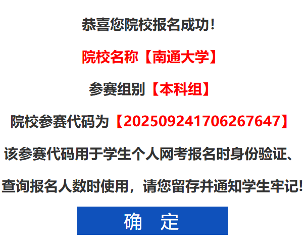 1.中国商业统计学会官网http://www.china-cssc.org,“第十六届全国大学生市场调查与分析大赛”专题网页,今年南通大学院校本科组参赛代码为:【202509241706267647】,研究生组参赛代码为:【202509241709577081】。