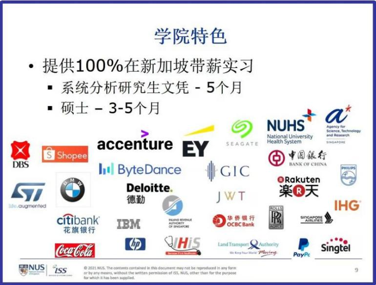 新加坡国立大学全日制授课7个月(5门课程)+5个月实习(国立大学100%安排)。所学课程考核30%为作业+70%考试,且需达到GPA2.25,则进入为期5个月的实习(internship 8-12月)。全部课程完成后可以获得国立大学的研究生文凭(Graduate Diploma)。