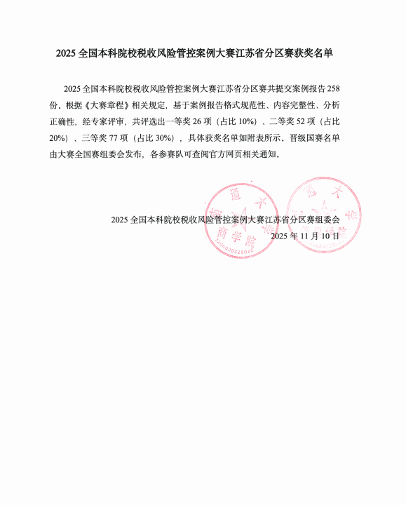 2025全国本科院校税收风险管控案例大赛江苏省分区赛共提交案例报告258份。根据《大赛章程》相关规定,基于案例报告格式规范性、内容完整性、分析正确性,经专家评审,共评选出一等奖26项(占比10%)、二等奖52项(占比20%)、三等奖77项(占比30%),具体获奖名单如附表所示。晋级国赛名单由大赛全国赛组委会发布,各参赛队可查阅官方网页相关通知。