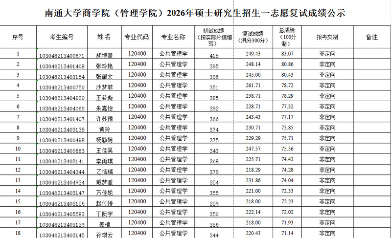 南通大学商学院(管理学院)2026年硕士研究生招生一志愿复试成绩公示