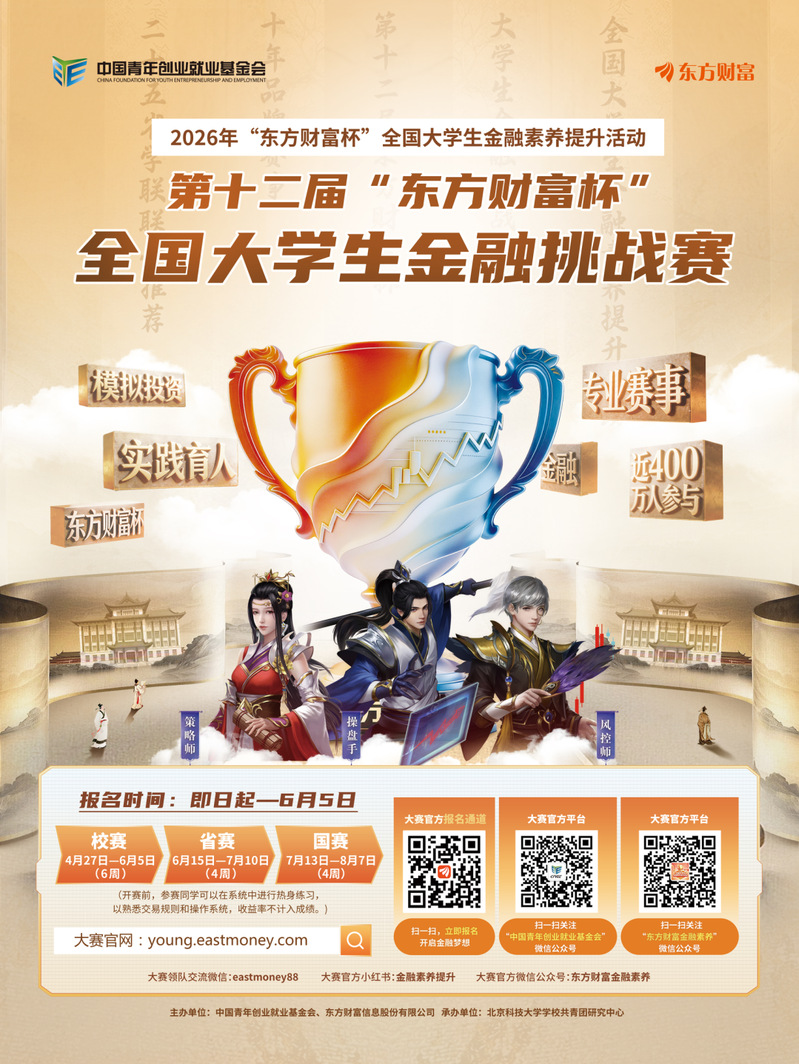 建设金融强国,迫切需要大批有志青年投身金融事业。为组织动员广大高校青年学生学习金融知识、提升金融素养,提振发展信心、提高社会化能力,积极投身金融强国建设,为以中国式现代化全面推进强国建设、民族复兴提供有力支撑,中国青年创业就业基金会、东方财富信息股份有限公司联合举办第十二届“东方财富杯”全国大学生金融挑战赛,作为“东方财富杯”全国大学生金融素养提升活动的重要内容。